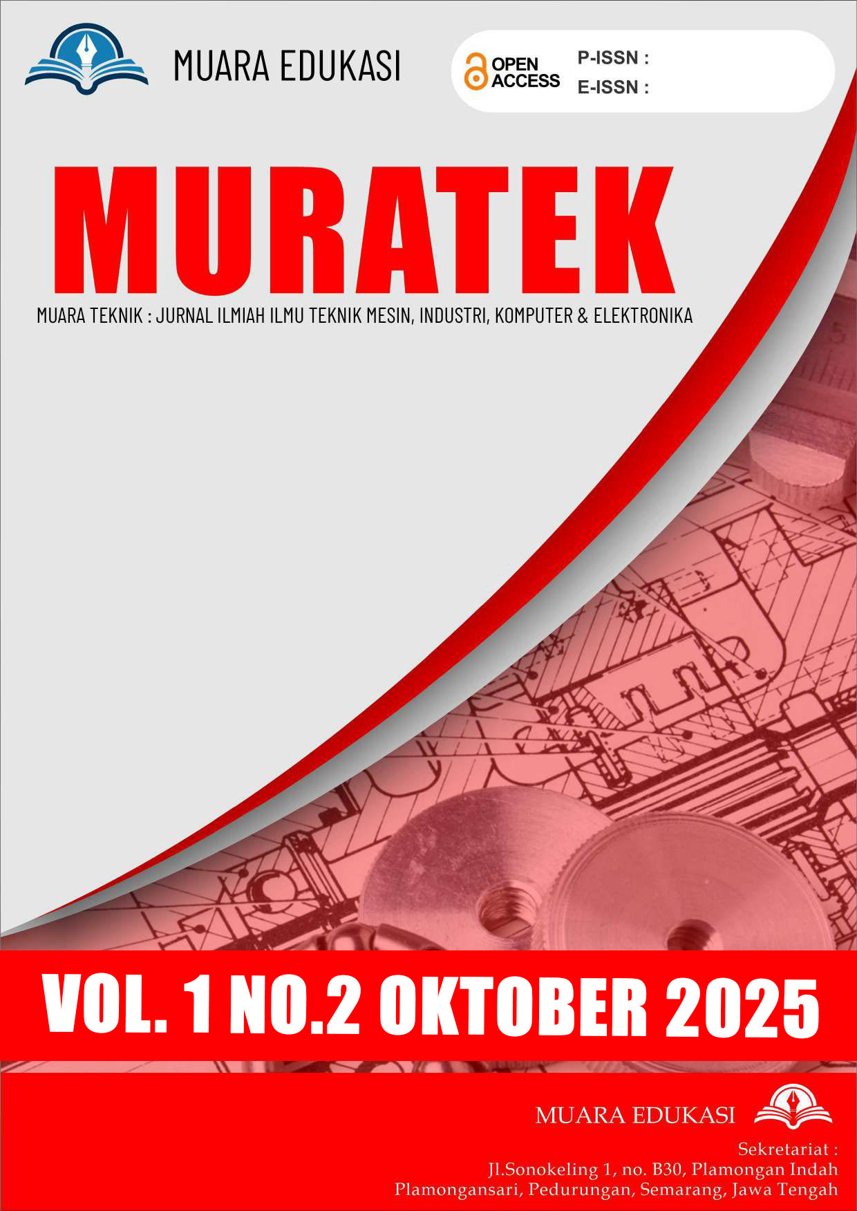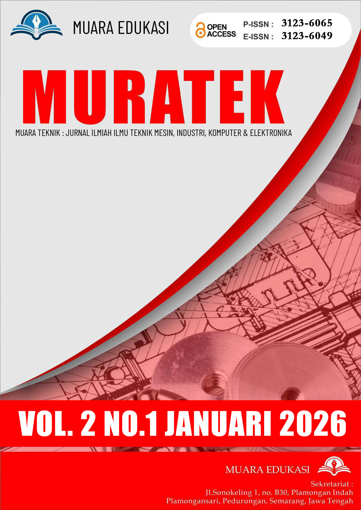 Vol. 2 No. 1 (2026)MUARA TEKNIK: Jurnal Ilmiah Ilmu Teknik Mesin, Industri dan Komputer adalah jurnal ilmiah terbitan CV Muara Edukasi dengan ISSN 3123-6049 (cetak) dan 3123-6065 (online) serta DOI 10.64365. Terbit empat kali setahun, jurnal ini mengusung visi integratif di persimpangan tiga rumpun keilmuan: teknik mesin, teknik industri, dan ilmu komputer. Ruang lingkupnya mencakup riset terapan mulai dari rekayasa kualitas, ergonomi, manajemen energi, hingga kecerdasan buatan dan IoT. Sejak volume perdananya (2025), jurnal ini secara konsisten menampilkan riset-riset interdisipliner yang merespons dinamika industri 4.0, sekaligus menunjukkan tata kelola akademik yang ketat melalui sistem deteksi plagiarisme dan proses review sistematis.